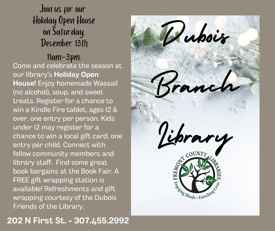 Enjoy homemade non-alcoholic wassail, soup, and sweet treats. There will be a fun holiday ornament craft for the kids. Find some great bargains at the Book Fair. Register for a chance to win prizes. Connect with fellow community members and library staff. Refreshments and free gift wrapping courtesy of the Dubois Friends of the Library.